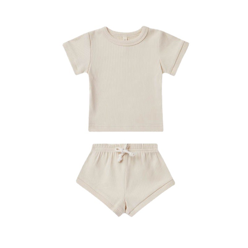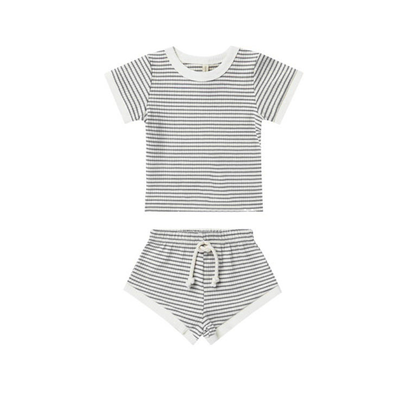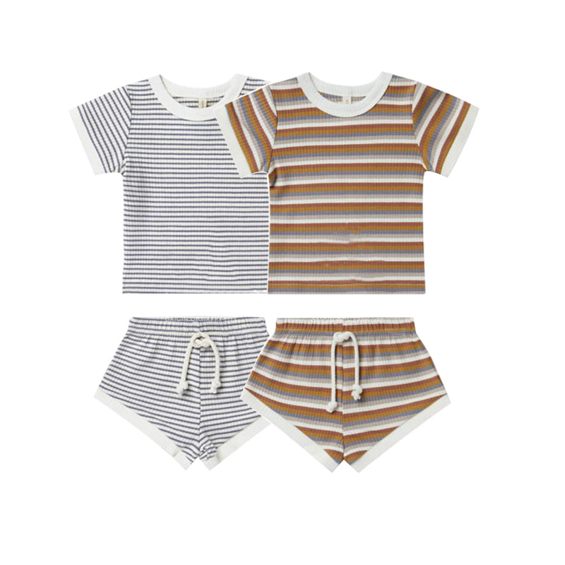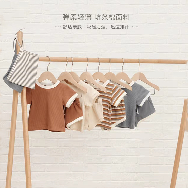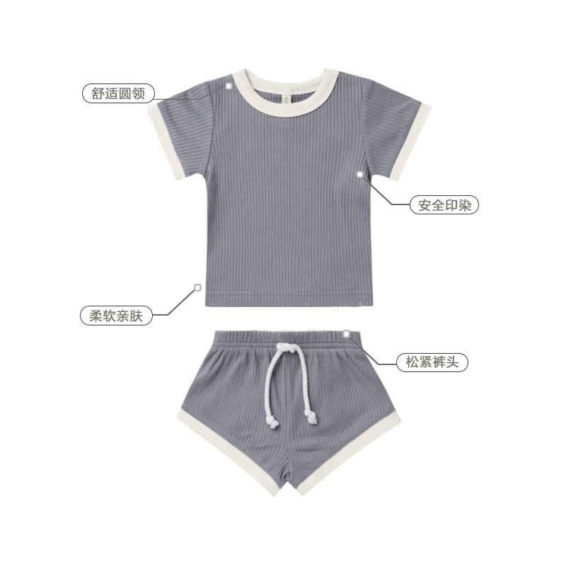 商品名称:儿童短袖套装2023欧美风男女童夏季新款T恤短裤宝宝坑条棉两件套